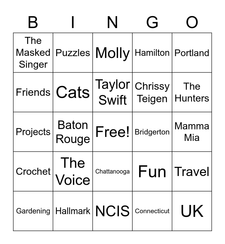 This bingo card has a free space and 27 words: Fun, Creative, Chrissy Teigen, NCIS, Friends, Molly, Puzzles, Crochet, Bridgerton, Travel, Projects, Hamilton, Gardening, Hallmark, The Hunters, Steel Magnolias, Cats, Taylor Swift, The Voice, The Masked Singer, Mamma Mia, Connecticut, Baton Rouge, UK, Chattanooga, Portland and Columbia.