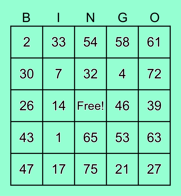 This bingo card has a free space and 24 words: 1, 17, 32, 47, 61, 2, 30, 33, 46, 65, 4, 26, 53, 63, 7, 21, 39, 54, 72, 14, 27, 43, 58 and 75.