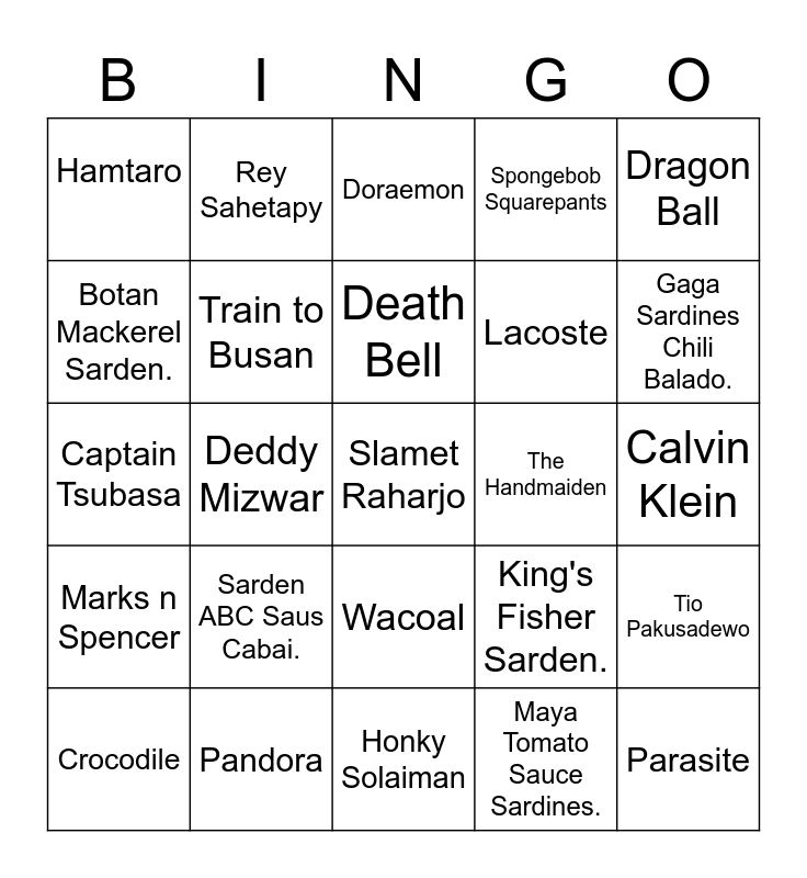This bingo card has 25 words: Sarden ABC Saus Cabai., Honky Solaiman, Death Bell, Crocodile, Dragon Ball, Hamtaro, Botan Mackerel Sarden., Rey Sahetapy, The Handmaiden, Wacoal, Lacoste, Captain Tsubasa, King's Fisher Sarden., Tio Pakusadewo, Train to Busan, Parasite, Calvin Klein, Doraemon, Gaga Sardines Chili Balado., Deddy Mizwar, Slamet Raharjo, Pandora, Marks n Spencer, Spongebob Squarepants and Maya Tomato Sauce Sardines..