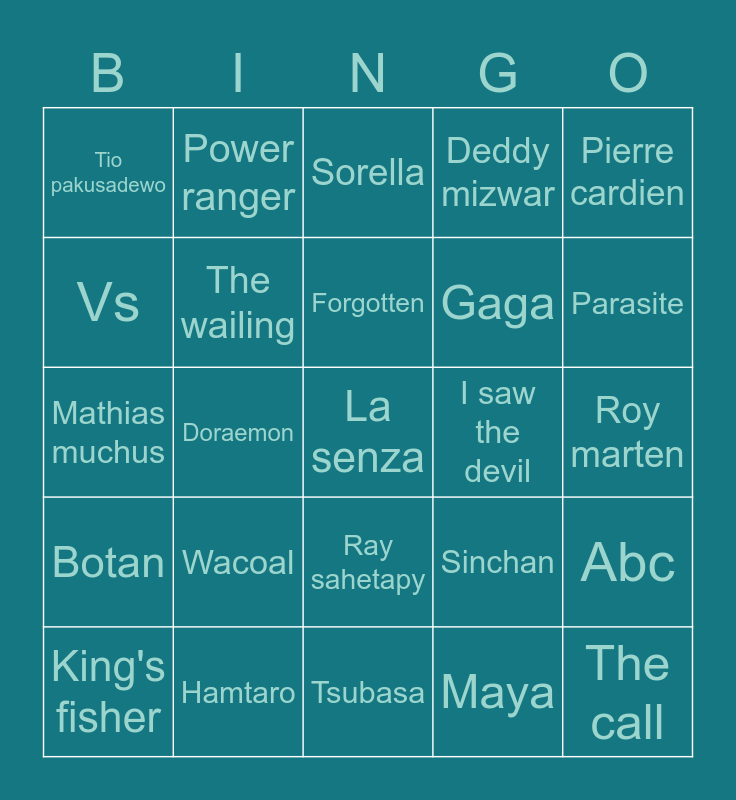 This bingo card has a free space and 24 words: Wacoal, Hamtaro, Forgotten, King's fisher, Pierre cardien, Tio pakusadewo, Vs, Power ranger, I saw the devil, Ray sahetapy, Gaga, Mathias muchus, Sinchan, Abc, The wailing, Maya, Roy marten, Sorella, Parasite, Doraemon, The call, Botan, Deddy mizwar and Tsubasa.
