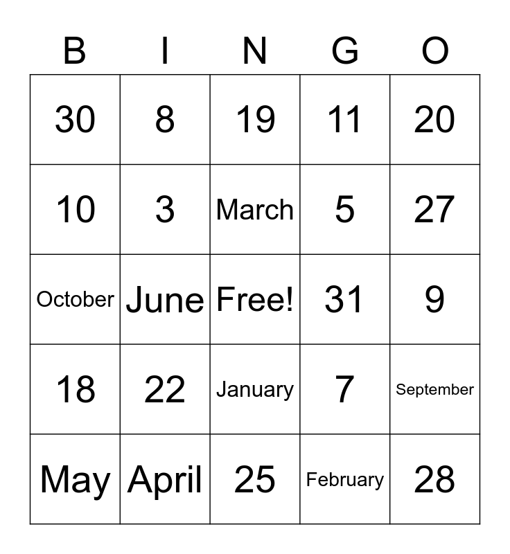 This bingo card has a free space and 26 words: January, February, March, April, 20, 30, 10, 8, 9, 7, 5, October, September, May, June, 12, 11, 18, 19, 28, 27, 25, 31, 22, 3 and 2.