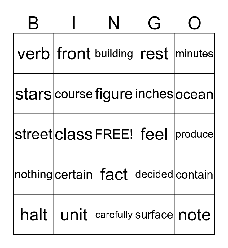 This bingo card has a free space and 24 words: certain, unit, figure, halt, minutes, verb, stars, front, feel, fact, inches, street, decided, contain, course, surface, produce, building, ocean, class, note, nothing, rest and carefully.