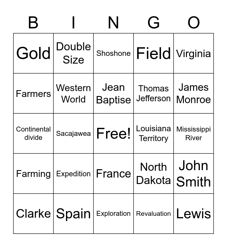 This bingo card has a free space and 36 words: Treaty, Purchase, Louisiana, Thomas Jefferson, Lewis, Clarke, Expedition, Congress, Field, Expansion, Farming, Sacajawea, Wilderness, Mississippi River, Continental divide, Double Size, Exploration, Louisiana Territory, James Monroe, Gold, Spain, Jean Baptise, North Dakota, Oregon, Hidastu, Western World, Shoshone, Toussaint Charbonneau, Virginia, Farmers, 16 Million Dollars, France, Revaluation, John Smith, Napoleon War and Military Commander.