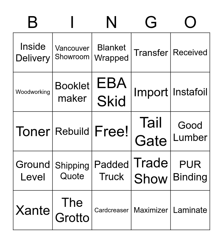 This bingo card has a free space and 37 words: P.O., Strapping, Duplo, Booklet maker, PUR Binding, Shipping Quote, EBA Skid, Auto Pig Plunger, Received, Camping, Rebuild, Transfer, Laminate, Good Lumber, Woodworking, Ground Level, Dock, Blanket Wrapped, Padded Truck, Tail Gate, Inside Delivery, Instafoil, Xante, Cardcreaser, Quickbooks, Maximizer, Vancouver Showroom, Customs, Morgana, Coil Binding, Ants, The Grotto, Toner, Blue Sheet, Trade Show, Import and Export.