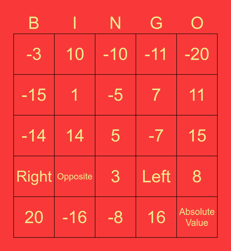 This bingo card has 25 words: Right, -16, 5, 16, -20, -3, 10, -10, -7, 8, -15, 1, -8, Left, 11, 20, 14, -5, 7, 15, -14, Opposite, 3, -11 and Absolute Value.