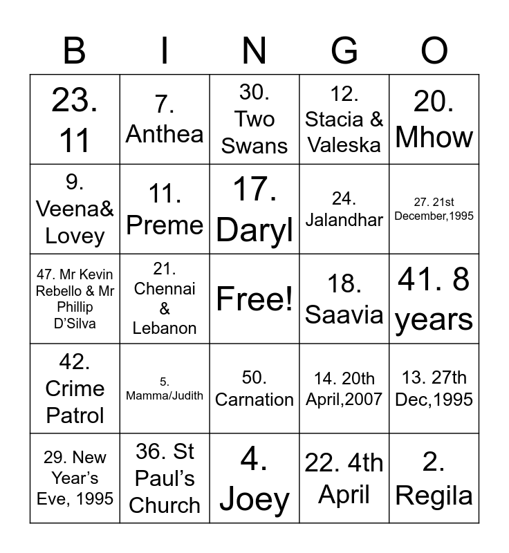 This bingo card has a free space and 51 words: Owen, 2. Regila, 3. Edson, 4. Joey, 5. Mamma/Judith, 6. Mai/Ledwin, 7. Anthea, 8. Odelia, 9. Veena& Lovey, 10. Austin & Yvette, 11. Preme, 12. Stacia & Valeska, 13. 27th Dec,1995, 14. 20th April,2007, 15. George, 16. Lady in Red, 17. Daryl, 18. Saavia, 19. Lonavla & Khandala, 20. Mhow, 21. Chennai & Lebanon, 22. 4th April, 23. 11, 24. Jalandhar, 25. 13, 26. 25th December, 1995, 27. 21st December,1995, 28. Leather Purse & Shirt, 29. New Year’s Eve, 1995, 30. Two Swans, 31. Xavier Pereira, 32. St. Mary’s SSC Grounds, 33. Fr. Joseph D’Souza, 34. Brown Salwar, 35. Love Letters, Telephone calls and Cards, 36. St Paul’s Church, 37. 4 months, 38. 6th Anniversary, 39. Walty, 40. St Fracis Xavier’s Church, Ville Parle, 41. 8 years, 42. Crime Patrol, 43. Annie’s Song, 44. Paint My love, 45. Saturday, 46. Fr. Anthony Futardo, 47. Mr Kevin Rebello & Mr Phillip D’Silva, 48. Raymond, 49. Crimson Rage, 50. Carnation and 51. Anita & Ronny.