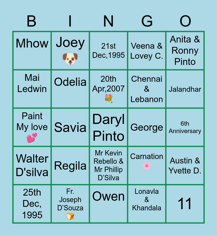 This bingo card has 51 words: Sr. Preme, Daryl Pinto, Crimson Rage 🎸, Owen, Regila, Edson, Joey🐶, Mamma Judith, Mai Ledwin, Anthea, Odelia, Veena & Lovey C., Austin & Yvette D., Carnation 🌸, Stacia & Valeska, 27th Dec,1995 💍, 20th Apr,2007 💐, George, Lady in Red 💃, Anita & Ronny Pinto, Savia, Lonavla & Khandala, Mhow, Chennai & Lebanon, 4th Apr 2021 🏠, 11, Jalandhar, 13, 25th Dec, 1995, 21st Dec,1995, Leather Purse & Shirt, New Year’s Eve, 1995, Two Swans, Xavier Pereira 📸, St. Mary’s SSC Grounds, Fr. Joseph D’Souza 🍞, Brown Salwar 🥻, ♥ Love Letters and Telephone calls ♥, St Paul's Church ⛪, 4 months, 6th Anniversary, Walter D'silva, St Francis Xavier Church ⛪, 8 years, Crime Patrol 🚓, Annie’s Song 💓, Paint My love 💕, Saturday, Fr. Anthony Futardo, Mr Kevin Rebello & Mr Phillip D’Silva and Raymond.