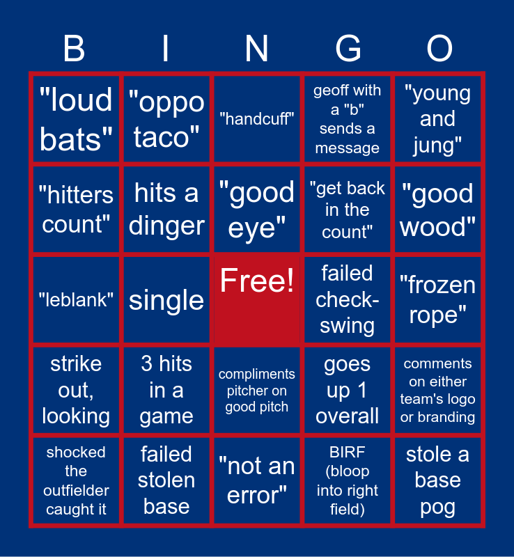 This bingo card has a free space and 32 words: BIRF (bloop into right field), "can of corn", single, "take it out of baseball", strike out, looking, hits a dinger, "young and jung", comments on either team's logo or branding, "oppo taco", "that was my pitch", "good eye", "handcuff", PERFECT PERFECT, bad base-running results in an out, failed check-swing, grounds into double play, shocked the outfielder caught it, "leblank", compliments pitcher on good pitch, 3 hits in a game, goes up 1 overall, "hang it/bang it" "hung it/bung it", "frozen rope", failed stolen base, stole a base pog, geoff with a "b" sends a message, "get back in the count", "hitters count", "loud bats", "not an error", thinks its a dinger but its not and "good wood".