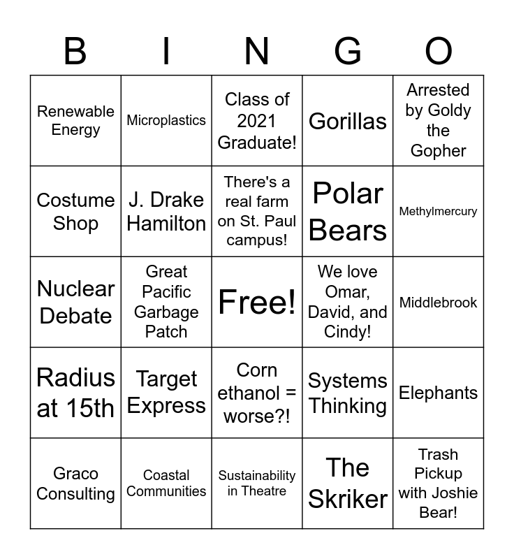 This bingo card has a free space and 29 words: Graco Consulting, Campus Hotel Hostage Incident, Great Pacific Garbage Patch, 5 Gyres, Renewable Energy, Class of 2021 Graduate!, J. Drake Hamilton, Target Express, We love Omar, David, and Cindy!, Coastal Communities, Middlebrook, Trash Pickup with Joshie Bear!, Sustainability in Theatre, The Skriker, Methylmercury, St Paul Campus Cow Sculptures, Corn ethanol = worse?!, Radius at 15th, Arrested by Goldy the Gopher, Nuclear Debate, Systems Thinking, Orangutans, Polar Bears, Costume Shop, Gorillas, Microplastics, Elephants, There's a real farm on St. Paul campus! and Embrace the Bunker.