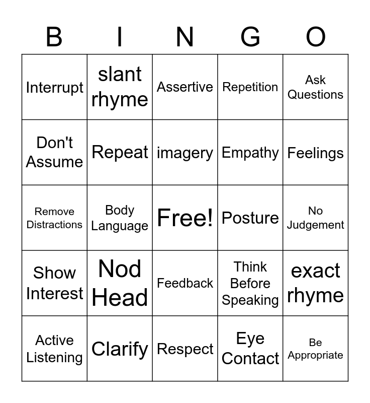 This bingo card has a free space and 29 words: Active Listening, Pay Attention, Body Language, Reflect, Interrupt, Assertive, Repeat, Nod Head, Posture, Clarify, No Judgement, Be Appropriate, Respect, Eye Contact, Feelings, Patience, Feedback, Show Interest, Ask Questions, Remove Distractions, Think Before Speaking, Avoid Prejudice Thoughts, Empathy, Don't Assume, Repetition, slant rhyme, exact rhyme, imagery and onomatopoeia.