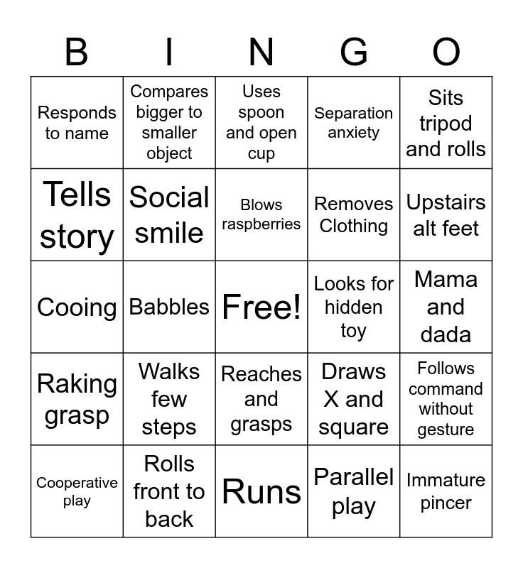 This bingo card has a free space and 41 words: Holds head up prone, Cooing, Follows past midline, Social smile, Rolls front to back, Reaches and grasps, Blows raspberries, Hands in mouth, Sits tripod and rolls, Raking grasp, Babbles, Separation anxiety, Immature pincer, Mama and dada, Looks for hidden toy, Walks few steps, Fine pincer grasp, Responds to name, Points at wanted objects, Uses spoon and open cup, Follows command without gesture, Points at interesting objects, Runs, Removes Clothing, Knows ten to twenty five words, Symbolic play, Parallel play, Two word phrases, Upstairs alt feet, Draws circle, Three to four word phrases, Compares bigger to smaller object, Cooperative play, Down stairs alt feet, Draws X and square, Tells story, Opposites and colors, Names friend, Skips, Draws person and Recites ABCs.