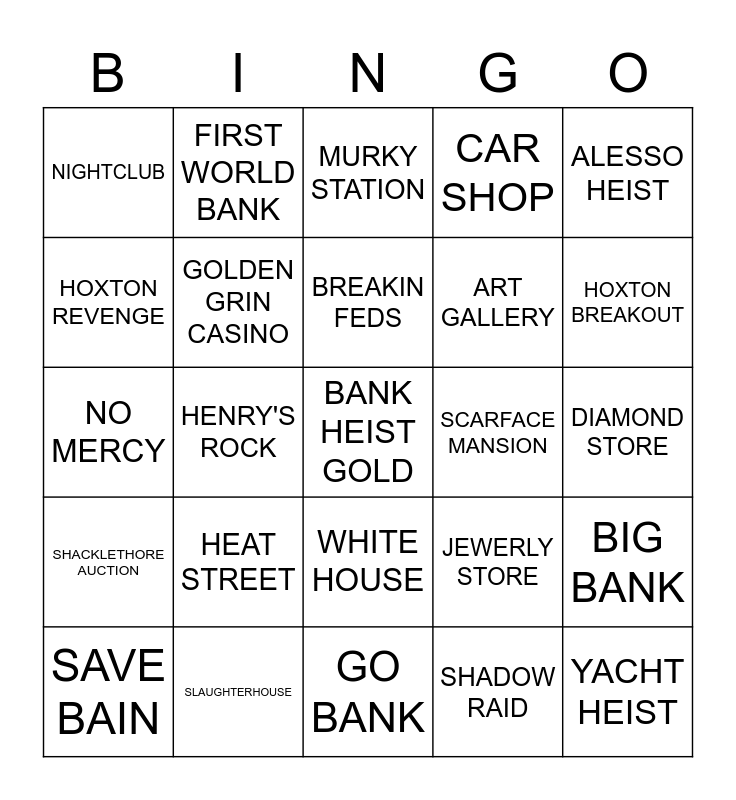 This bingo card has a free space and 24 words: HEAT STREET, SLAUGHTERHOUSE, BREAKIN FEDS, SAVE BAIN, ALESSO HEIST, NIGHTCLUB, HOXTON REVENGE, FIRST WORLD BANK, SCARFACE MANSION, WHITE HOUSE, ART GALLERY, NO MERCY, JEWERLY STORE, BIG BANK, GOLDEN GRIN CASINO, SHADOW RAID, DIAMOND STORE, MURKY STATION, HOXTON BREAKOUT, HENRY'S ROCK, YACHT HEIST, SHACKLETHORE AUCTION, CAR SHOP and GO BANK.