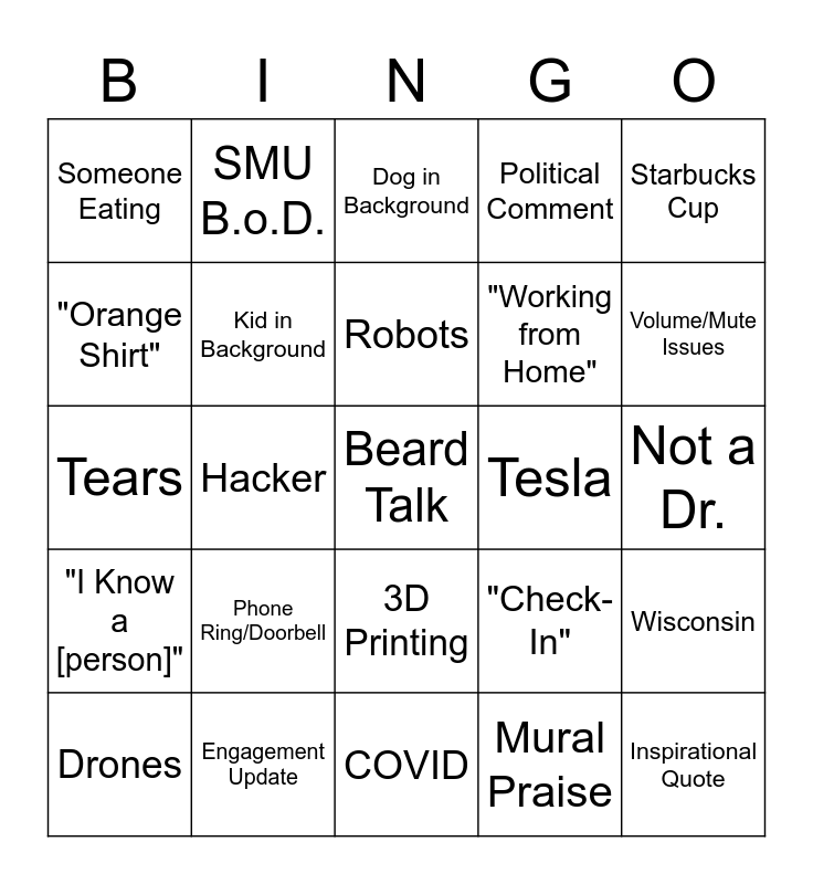 This bingo card has 30 words: Engagement Update, Vietnam, Hacker, Someone Sleeping, Someone Eating, Dog in Background, Kid in Background, 3D Printing, Tesla, COVID, Not a Dr., Beard Talk, Mural Praise, Inspirational Quote, Volume/Mute Issues, Google, "Check-In", "I Know a [person]", Phone Ring/Doorbell, Starbucks Cup, Tears, "Future Leaders", SMU B.o.D., "Working from Home", "Orange Shirt", Political Comment, Wisconsin, Drones, Robots and Millennials.