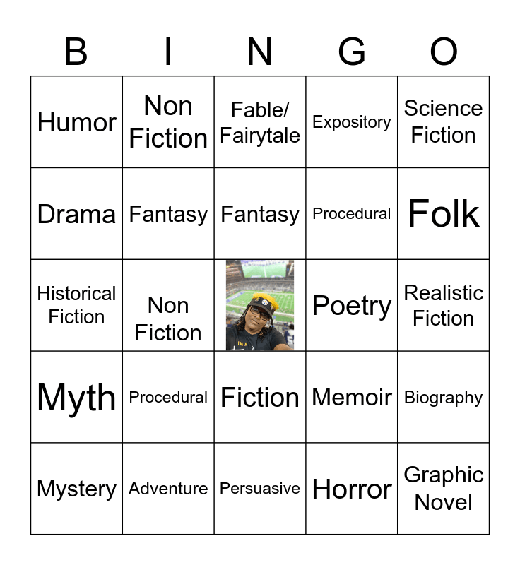 This bingo card has a free space and 24 words: Procedural, Adventure, Fantasy, Mystery, Science Fiction, Humor, Drama, Non Fiction, Poetry, Fiction, Procedural, Historical Fiction, Memoir, Biography, Fantasy, Horror, Realistic Fiction, Fable/ Fairytale, Folk, Non Fiction, Graphic Novel, Myth, Expository and Persuasive.