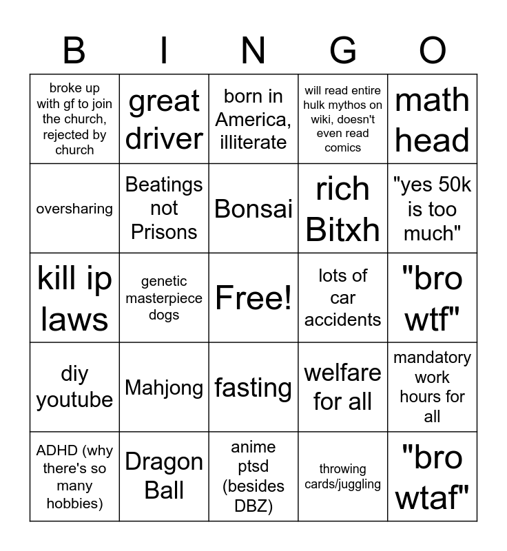 This bingo card has a free space and 24 words: Mahjong, Dragon Ball, Bonsai, ADHD (why there's so many hobbies), math head, broke up with gf to join the church, rejected by church, oversharing, great driver, lots of car accidents, fasting, rich Bitxh, kill ip laws, welfare for all, mandatory work hours for all, Beatings not Prisons, throwing cards/juggling, "bro wtf", born in America, illiterate, "yes 50k is too much", genetic masterpiece dogs, "bro wtaf", diy youtube, will read entire hulk mythos on wiki, doesn't even read comics and anime ptsd (besides DBZ).