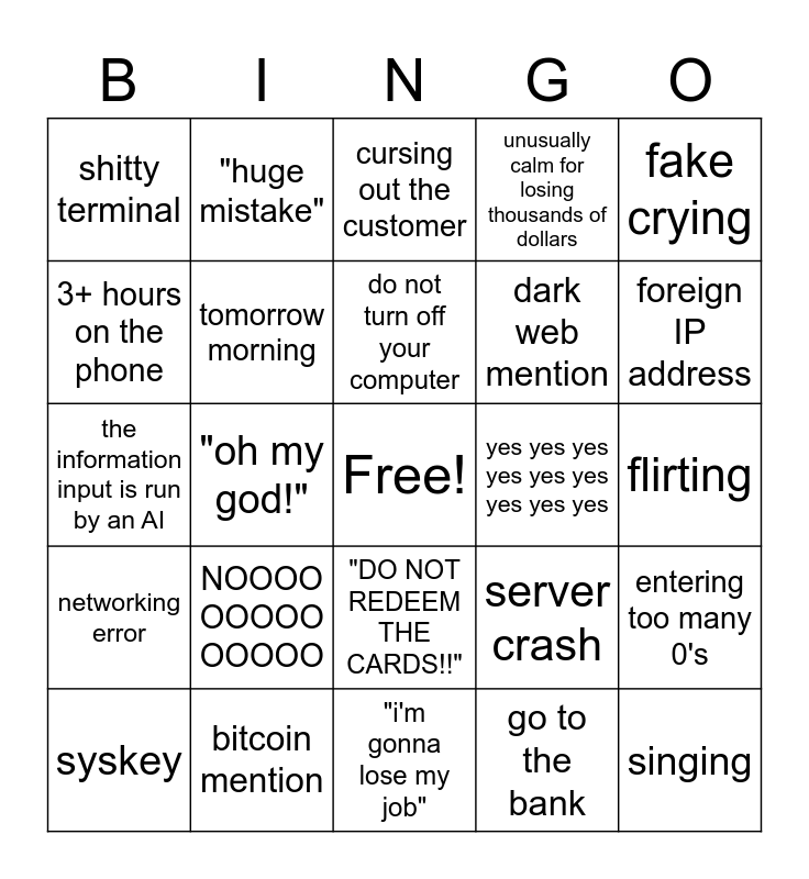 This bingo card has a free space and 24 words: NOOOO OOOOO OOOOO, bitcoin mention, do not turn off your computer, syskey, fake crying, shitty terminal, 3+ hours on the phone, "huge mistake", yes yes yes yes yes yes yes yes yes, "DO NOT REDEEM THE CARDS!!", dark web mention, the information input is run by an AI, server crash, entering too many 0's, tomorrow morning, go to the bank, flirting, cursing out the customer, foreign IP address, "oh my god!", singing, networking error, unusually calm for losing thousands of dollars and "i'm gonna lose my job".