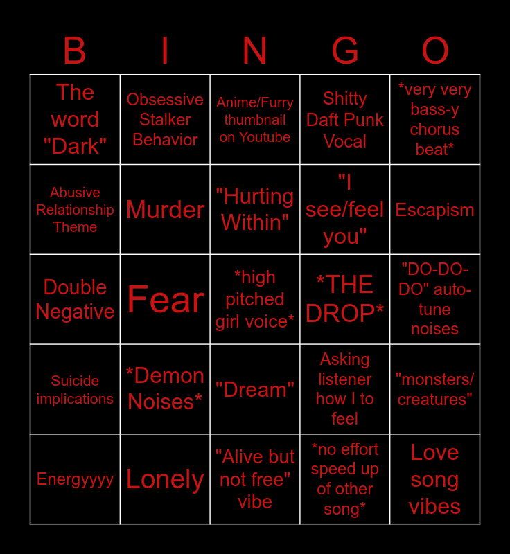 This bingo card has a free space and 24 words: *Demon Noises*, Lonely, "Hurting Within", Energyyyy, *very very bass-y chorus beat*, The word "Dark", Abusive Relationship Theme, Obsessive Stalker Behavior, *THE DROP*, "Dream", "I see/feel you", Double Negative, Asking listener how I to feel, "monsters/ creatures", Murder, *no effort speed up of other song*, "DO-DO-DO" auto-tune noises, Anime/Furry thumbnail on Youtube, Escapism, Fear, Love song vibes, Suicide implications, Shitty Daft Punk Vocal and "Alive but not free" vibe.