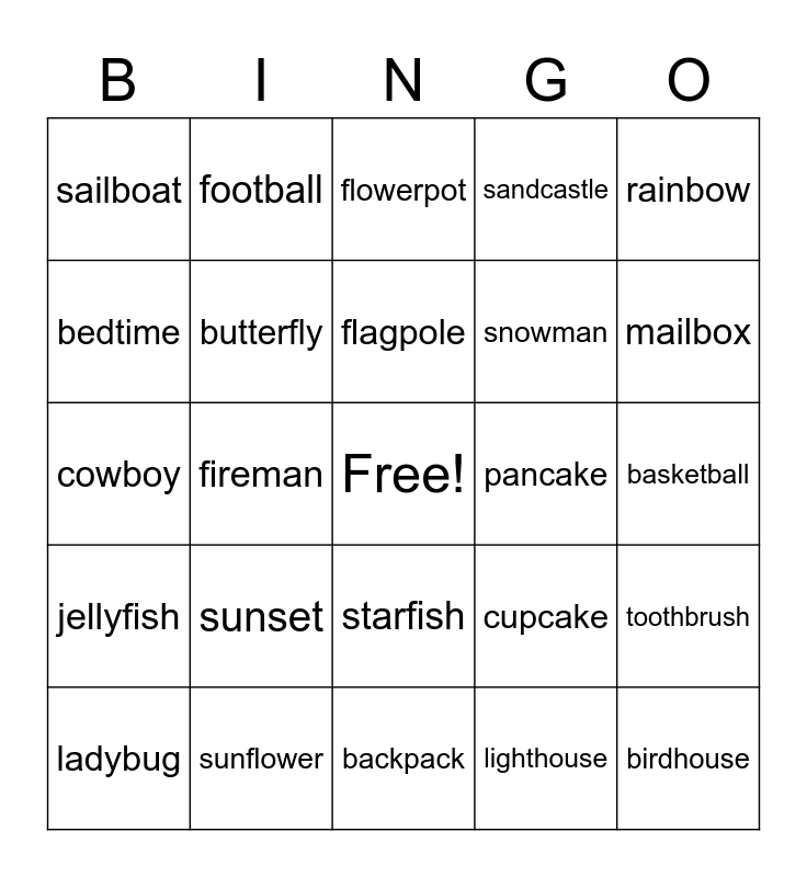 This bingo card has a free space and 25 words: sunset, backpack, flagpole, ladybug, rainbow, sailboat, bedtime, football, pancake, starfish, snowman, cowboy, cupcake, toothbrush, butterfly, raincoat, basketball, flowerpot, mailbox, fireman, birdhouse, sunflower, jellyfish, sandcastle and lighthouse.