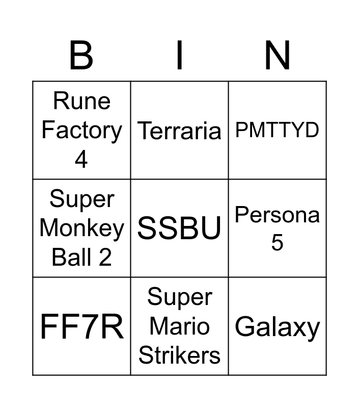 This bingo card has a free space and 8 words: Persona 5, PMTTYD, Terraria, FF7R, Rune Factory 4, Galaxy, Super Monkey Ball 2 and Super Mario Strikers.