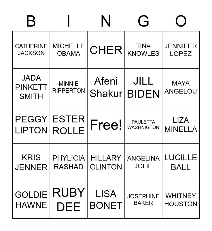 This bingo card has a free space and 24 words: PHYLICIA RASHAD, RUBY DEE, Afeni Shakur, GOLDIE HAWNE, JENNIFER LOPEZ, CATHERINE JACKSON, JADA PINKETT SMITH, MICHELLE OBAMA, PAULETTA WASHNIGTON, HILLARY CLINTON, JILL BIDEN, PEGGY LIPTON, ANGELINA JOLIE, LUCILLE BALL, MINNIE RIPPERTON, JOSEPHINE BAKER, LIZA MINELLA, CHER, MAYA ANGELOU, ESTER ROLLE, WHITNEY HOUSTON, KRIS JENNER, TINA KNOWLES and LISA BONET.