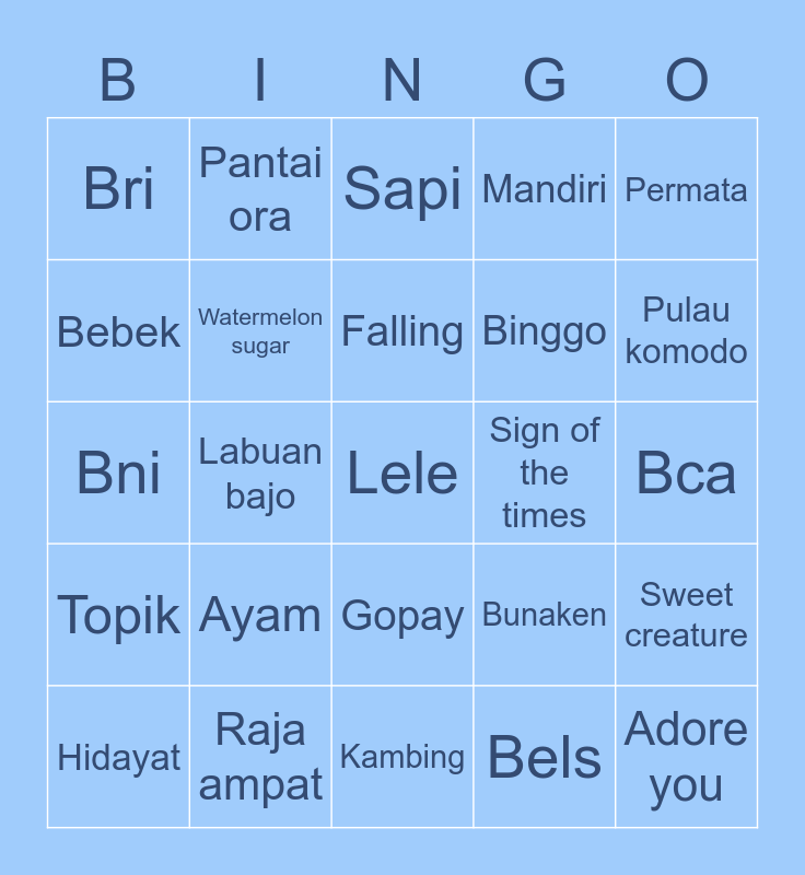 This bingo card has a free space and 24 words: Ayam, Raja ampat, Falling, Hidayat, Permata, Bri, Bebek, Pantai ora, Sign of the times, Gopay, Binggo, Bni, Bunaken, Sweet creature, Watermelon sugar, Bels, Bca, Sapi, Pulau komodo, Labuan bajo, Adore you, Topik, Mandiri and Kambing.