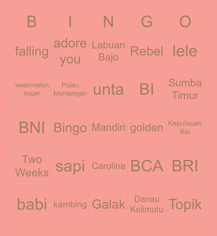 This bingo card has a free space and 24 words: sapi, kambing, unta, babi, lele, falling, watermelon sugar, adore you, golden, Carolina, BI, BNI, BCA, BRI, Pulau Menjangan, Danau Kelimutu, Kepulauan Kei, Labuan Bajo, Sumba Timur, Bingo, Topik, Two Weeks, Rebel and Galak.