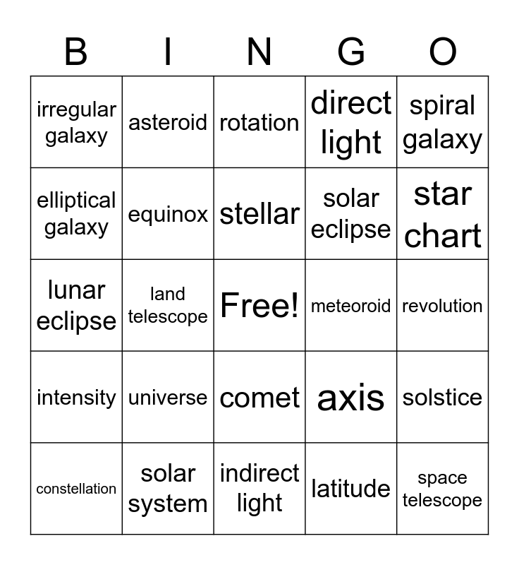 This bingo card has a free space and 24 words: universe, solar system, stellar, constellation, spiral galaxy, irregular galaxy, elliptical galaxy, asteroid, meteoroid, comet, solar eclipse, lunar eclipse, axis, solstice, equinox, latitude, revolution, rotation, star chart, land telescope, space telescope, intensity, direct light and indirect light.