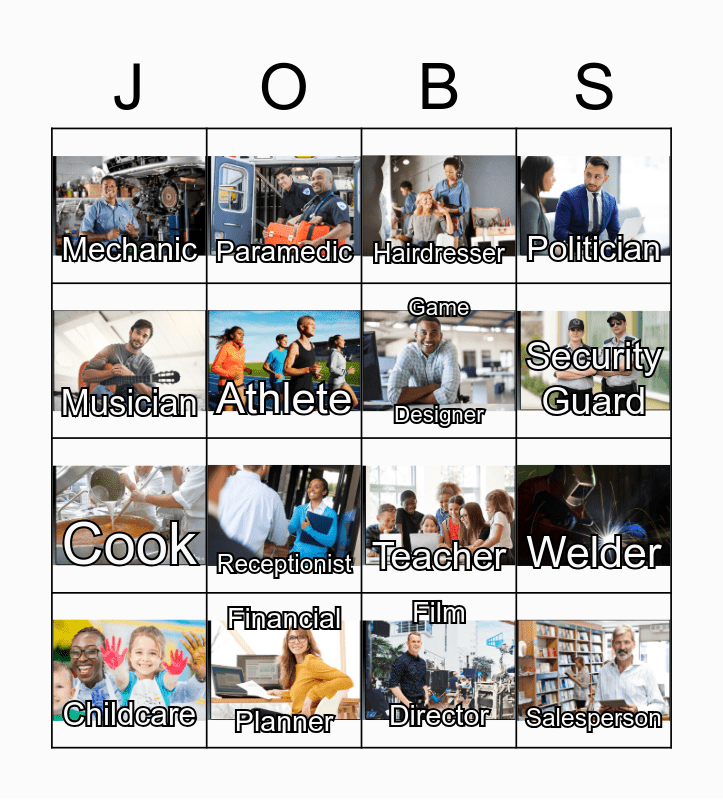 This bingo card has 20 images and 20 words: Childcare, Electrician, Hairdresser, Welder, Farmer, Receptionist, Film Director, Politician, Cook, Paramedic, Teacher, Security Guard, Mechanic, Financial Planner, Game Designer, Meteorologist, Musician, Athlete, Military and Salesperson.
