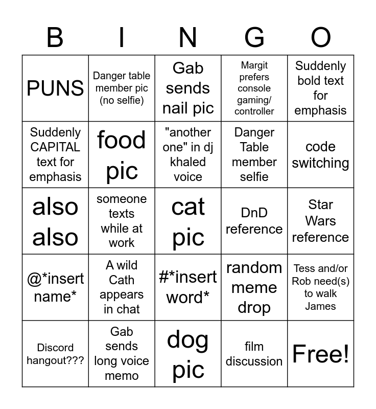 This bingo card has 31 words: dog pic, *insert weird accent* Waauw, someone texts while at work, boop the snoot, PUNS, Gab sends nail pic, food pic, random meme drop, DnD reference, film discussion, Star Wars reference, cat pic, Free!, Gif as answer, code switching, A wild Lisa appears in chat, Tess and/or Rob need(s) to walk James, A wild Cath appears in chat, @*insert name*, #*insert word*, Suddenly bold text for emphasis, Name drop a game, Discord hangout???, Danger table member pic (no selfie), Danger Table member selfie, Suddenly CAPITAL text for emphasis, Margit prefers console gaming/ controller, also also, Gab sends long voice memo, "another one" in dj khaled voice and "Look at all those chickens" in child voice.