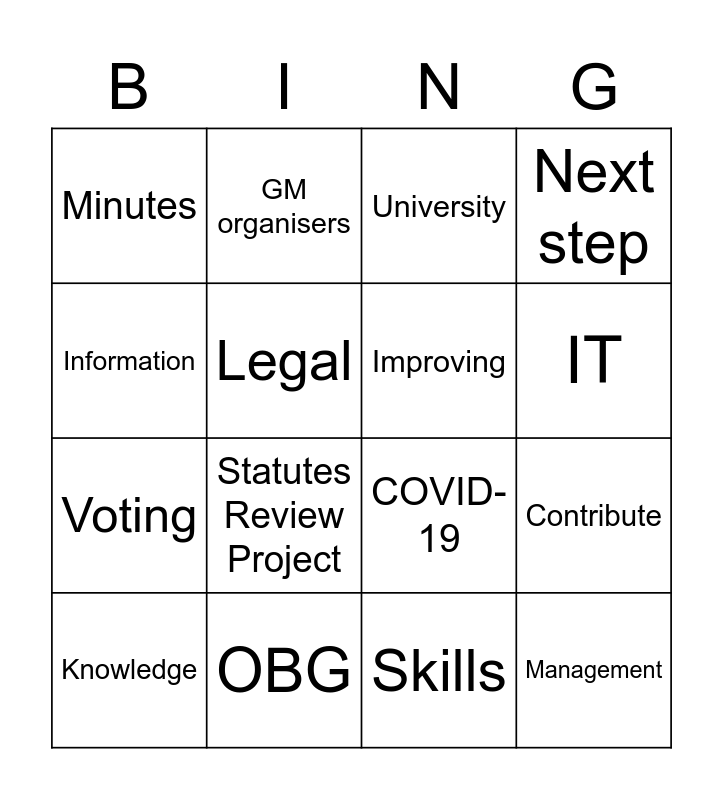 This bingo card has 49 words: Free!, Knowledge, PA, PM, Documents, Evaluation, GM organisers, Helpdesk, Legal, Skills, Improving, Next step, Boardie, Emails, Reports, Statuses, IT, OBG, Belgian law, Information, Contribute, Tasks, Minutes, Voting, VIP, Statutes Review Project, Mailing list, Decision making process, Legal status, Management, breaking breaking the law, LBG, Regulations, Athens, Coordinator, Department, Experience, Development, Skills, Online, Procedure, MO, Host, Interested, COVID-19, University, Student, International and Europe.