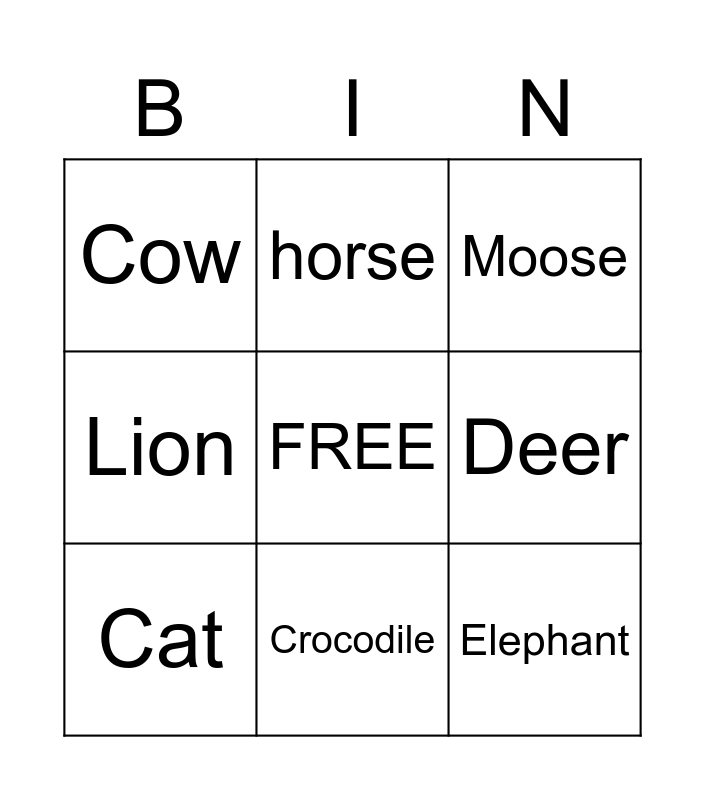 This bingo card has a free space and 14 words: Pig, Dog, Cat, horse, Lion, Elephant, Dragon, Mouse, Crocodile, Cow, Sheep, Deer, Moose and Bear.