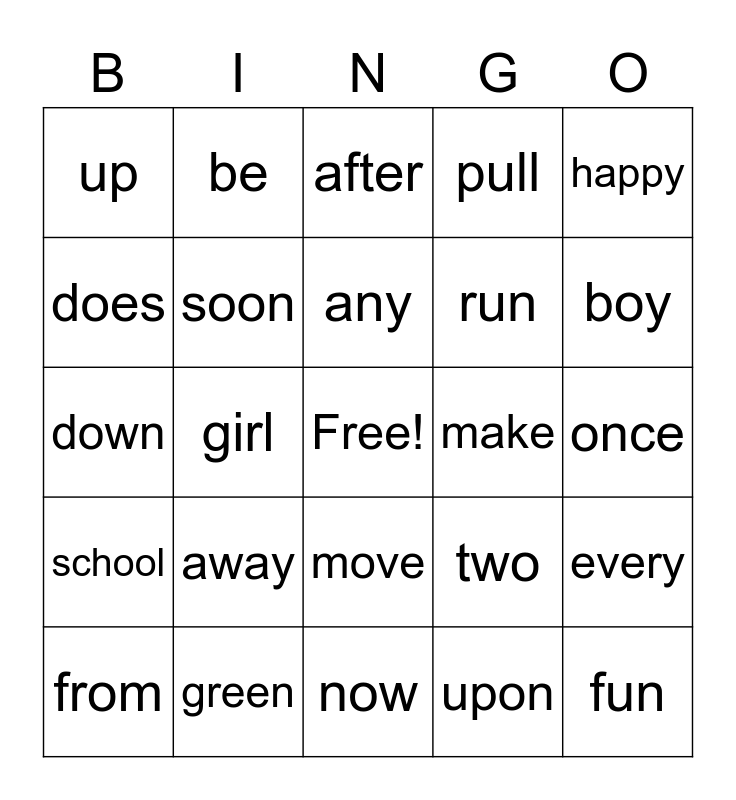 This bingo card has a free space and 24 words: away, green, any, from, happy, up, does, be, make, move, run, down, two, every, soon, upon, once, after, boy, girl, fun, school, pull and now.