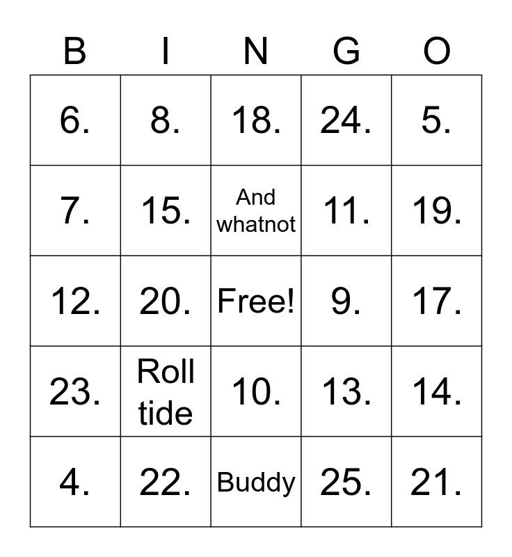 This bingo card has a free space and 25 words: Roll tide, Buddy, And whatnot, 4., 5., 6., 7., 8., 9., 10., 11., 12., 13., 14., 15., 16., 17., 18., 19., 20., 21., 22., 23., 24. and 25..