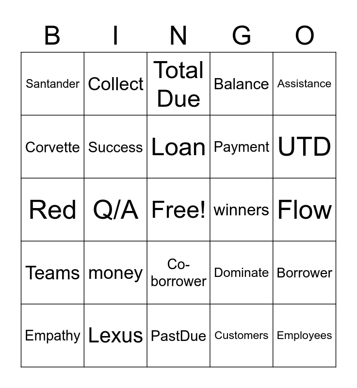 This bingo card has a free space and 24 words: money, Lexus, Loan, Empathy, Assistance, Santander, Corvette, Collect, winners, Co-borrower, Payment, Red, Dominate, Borrower, Success, Customers, Flow, Total Due, UTD, Q/A, Employees, Teams, Balance and PastDue.