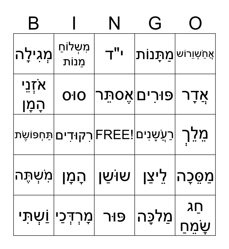 This bingo card has a free space and 24 words: הָמָן, מָרְדְּכַי, אֶסתֵּר, וַֹשְתִּי, אֲחַֹשְוֵרוֹש, מְגִילָה, אֹזְנֵי הָמָן, מִשְלוֹחַ מַנוֹת, רַעֲֹשָנִים, שוֹּשַן, פּוּרִים, תַּחְפּוֹשֶֹת, לֵיצַן, מַסֵּכָה, סוּס, מַלכָּה, מֵלֵךְ, י"ד, אֲדָר, רִקוּדִים, חַג שָֹמֵחַ, מִֹשְתֶּה, מַתָּנוֹת and פּוּר.