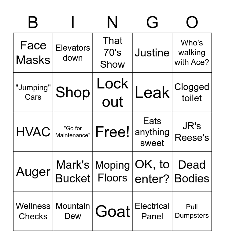 This bingo card has a free space and 24 words: Mark's Bucket, Mountain Dew, Lock out, Wellness Checks, Who's walking with Ace?, Face Masks, "Jumping" Cars, Elevators down, Eats anything sweet, Moping Floors, Leak, HVAC, OK, to enter?, Dead Bodies, Shop, Electrical Panel, JR's Reese's, That 70's Show, Clogged toilet, "Go for Maintenance", Pull Dumpsters, Auger, Justine and Goat.