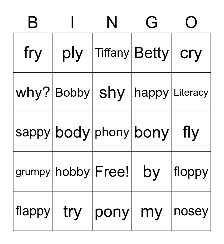 This bingo card has 26 words: Free!, my, shy, try, cry, fry, why?, ply, fly, by, happy, sappy, floppy, flappy, body, jetty, Betty, grumpy, Tiffany, phony, Literacy, pony, bony, hobby, Bobby and nosey.