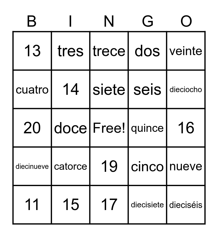 This bingo card has a free space and 29 words: 11, once, doce, 12, 13, trece, 14, catorce, quince, 15, 16, dieciséis, 17, diecisiete, dieciocho, 18, 19, diecinueve, veinte, 20, cinco, 5, seis, cuatro, dos, tres, nueve, siete and ocho.