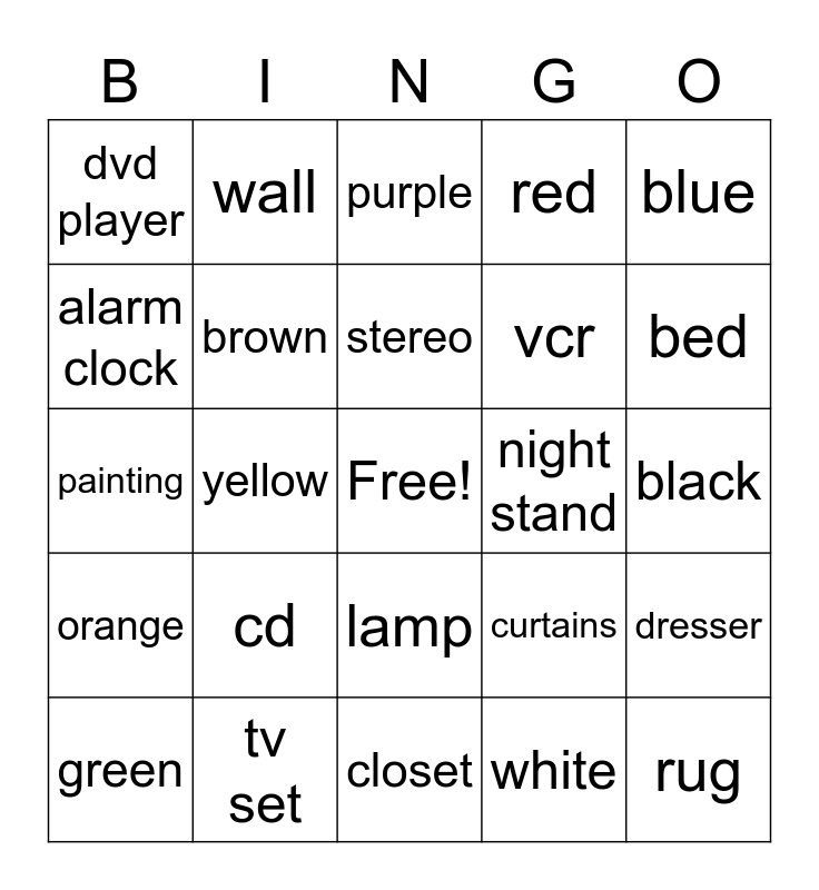 This bingo card has a free space and 24 words: cd, tv set, stereo, green, blue, dvd player, alarm clock, wall, night stand, lamp, vcr, painting, curtains, dresser, brown, white, black, purple, bed, yellow, rug, orange, red and closet.