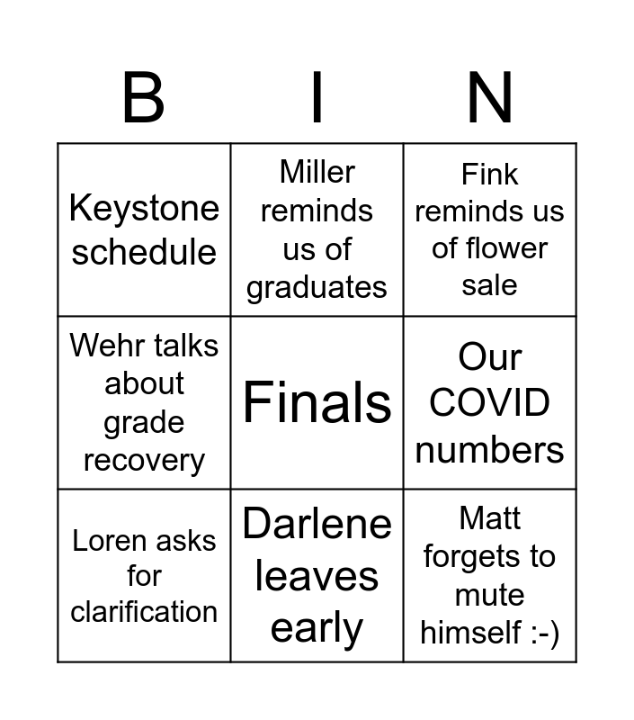 This bingo card has 9 words: Loren asks for clarification, Fink reminds us of flower sale, Miller reminds us of graduates, Wehr talks about grade recovery, Keystone schedule, Our COVID numbers, Finals, Matt forgets to mute himself :-) and Darlene leaves early.
