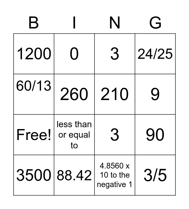This bingo card has 20 words: 90, 2035, 3, 162, 3500, 60/13, 88.42, 1200, Free!, 0, less than or equal to, 3, 260, 3/5, 210, 0.625, 9, 24/25, 4.8560 x 10 to the negative 1 and 49.3%.
