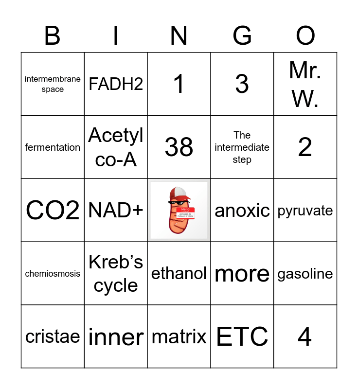 This bingo card has a free space and 34 words: ATP, NADH, oxygen, cytoplasm, pyruvate, fermentation, Acetyl co-A, matrix, The intermediate step, 4, CO2, FADH2, ETC, H+, chemiosmosis, NAD+, ethanol, anoxic, gasoline, cristae, inner, water, 3, 2, glycolysis, Kreb’s cycle, 1, ATP synthase, Mr. W., intermembrane space, 34, 38, more and lactate.