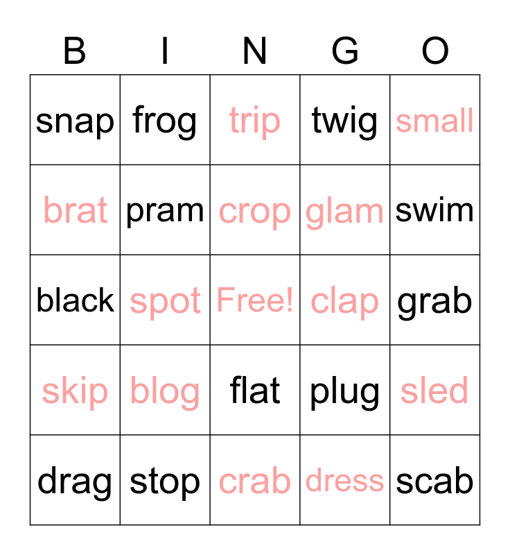 This bingo card has a free space and 24 words: blog, stop, crop, drag, small, snap, brat, frog, clap, flat, glam, black, plug, sled, pram, dress, grab, trip, swim, spot, scab, skip, twig and crab.