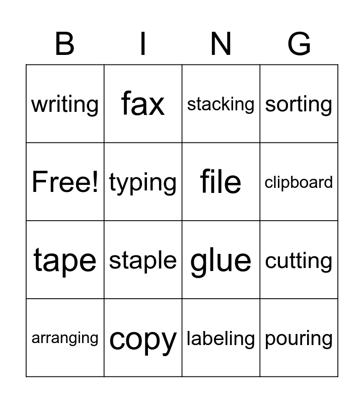 This bingo card has 16 words: copy, cutting, stacking, writing, tape, fax, glue, labeling, Free!, typing, arranging, sorting, staple, clipboard, file and pouring.