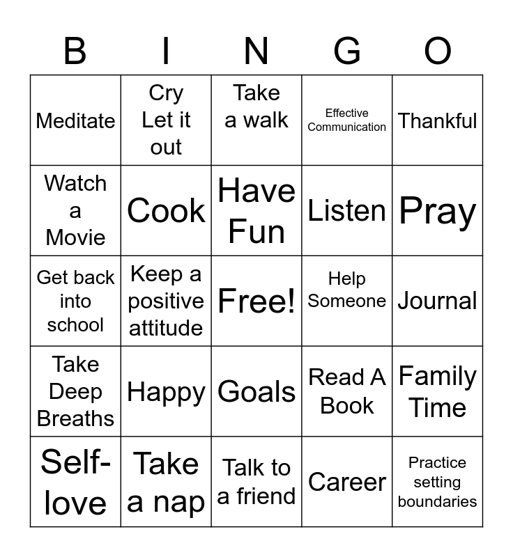 This bingo card has a free space and 24 words: Self-love, Happy, Have Fun, Career, Thankful, Meditate, Cry Let it out, Take a walk, Help Someone, Journal, Get back into school, Cook, Read A Book, Family Time, Watch a Movie, Take a nap, Talk to a friend, Effective Communication, Pray, Take Deep Breaths, Keep a positive attitude, Goals, Listen and Practice setting boundaries.