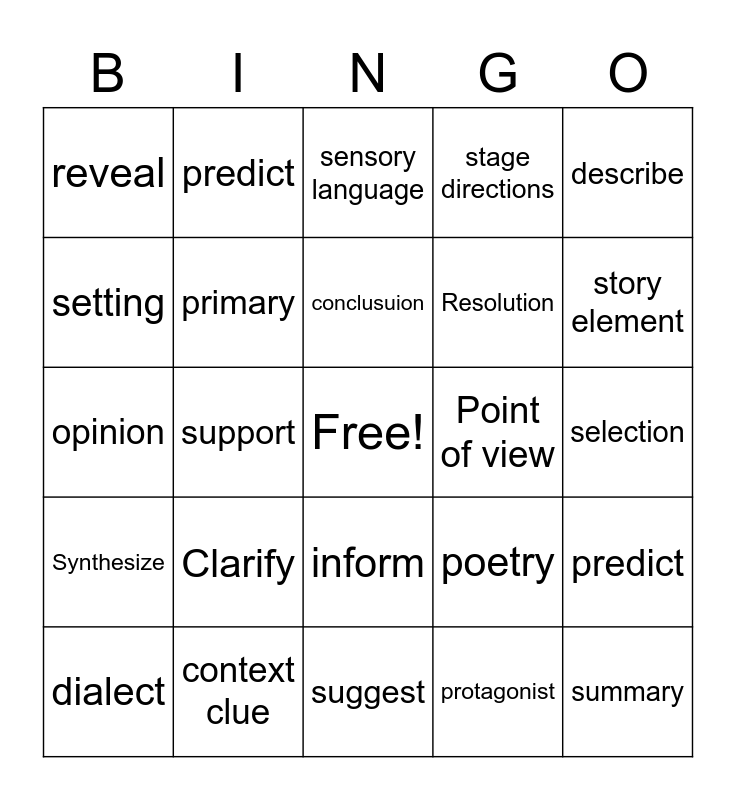 This bingo card has a free space and 24 words: Clarify, context clue, conclusuion, dialect, describe, reveal, setting, predict, Point of view, inform, Resolution, opinion, poetry, predict, primary, protagonist, selection, sensory language, story element, support, summary, Synthesize, stage directions and suggest.