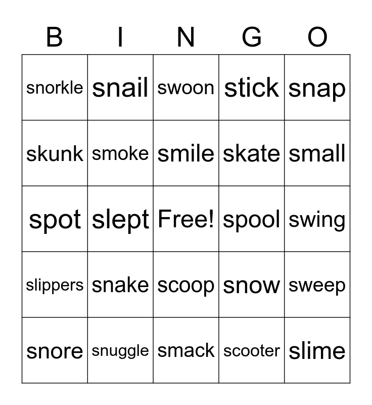 This bingo card has a free space and 24 words: snake, snuggle, smile, snore, snap, snorkle, skunk, snail, spool, scoop, skate, spot, snow, sweep, smoke, scooter, swing, swoon, small, slept, slime, slippers, stick and smack.