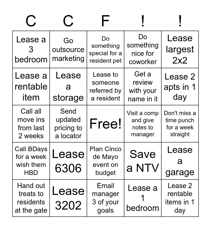 This bingo card has a free space and 24 words: Lease 6306, Lease 3202, Lease to someone referred by a resident, Hand out treats to residents at the gate, Lease largest 2x2, Lease a 3 bedroom, Lease a rentable item, Go outsource marketing, Visit a comp and give notes to manager, Plan Cinco de Mayo event on budget, Get a review with your name in it, Call all move ins from last 2 weeks, Save a NTV, Lease a garage, Lease a storage, Lease a 1 bedroom, Don't miss a time punch for a week straight, Do something special for a resident pet, Lease 2 apts in 1 day, Send updated pricing to a locator, Lease 2 rentable items in 1 day, Call BDays for a week wish them HBD, Do something nice for coworker and Email manager 3 of your goals.