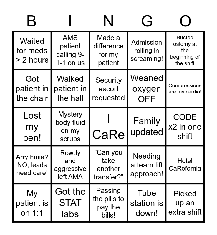 This bingo card has a free space and 84 words: RRT, Searched for missing property, Made a difference for my patient, Placed WOCC consult, Started an IV access, Medicated for pain, CHG bath, Called MD for orders, Called pharm for missing meds, D/C the foley, CODE, Made food for my patient, Walked patient in the hall, Family updated, Tracked down a wheelchair, Waited for meds > 2 hours, My patient is on 1:1, Got patient in the chair, Admission arrived during shift change, Batteries/leads replaced, BERT, Weaned oxygen OFF, Picked up an extra shift, Filed an incident report, Mystery body fluid on my scrubs, We dual sign that CADD at shift change, I forgot to punch IN/OUT, “I slept <4 hours”, Narcan STAT, CHF exacerbation asking for fluids Q15 min, Rowdy and aggressive left AMA, Hemolyzed specimen, Telemetry leads keep coming off!!!, Lost my pen!, Lost my patient!, Discharge to SNF was easy peasy!, Passing the pills to pay the bills!, CODE+BERT+RRT in one day, Compressions are my cardio!, Arrythmia? NO, leads need care!, Lost my BRAIN, Not appropiate for a double room, STAT labs ordered for tomorrow, This is my 3 admit of the day, This friend needs to be rotated, “I rather get that on IV form”, AMS patient calling 9-1-1 on us, Fire drill, Serial Caller, Patient refuses to go home/discharge, A coworker bought me coffee, Needing a team lift approach!, Admission rolling in screaming!, >400 lbs of responsibilities in a single room, Declining necessary shower/bed bath, “Can you bring patient to X-ray? Yes, the one that was ordered for bedside.”, Got the STAT labs, Security escort requested, “Wake me up for PRN pain meds Q2H”, CODE x2 in one shift, RN does not stand for Refreshments and Narcotics, Have you seen a wheelchair?, Working with your favorite HCA, Salty like 0.9% NS, Found my brain in the __________, Order: D/C foley & PUSH 80 mg Lasix, Gloves boxes inside COVID room, “Pain rated 12/10”, Busted ostomy at the beginning of the shift, “sorry, you have a fluid restriction”, Hotel CaRefornia, “...that med they gave me in the ED, starts with a D!”, Frequent flyer, Vaccinated, “Can you take another transfer?”, Tube station is down!, Please, put your mask on, Would you like to stay for a double?, TOTAL, TOTAL, TOTAL, Forgot my badge at home!, Transfer orders, IN, I used the sharps transportation container!, Drama-llama alert and If you were a bladder scan, where will you be?.