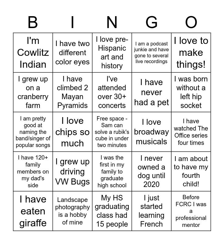 This bingo card has a free space and 24 words: I grew up driving VW Bugs, Landscape photography is a hobby of mine, I've attended over 30+ concerts, I have eaten giraffe, I love to make things!, I'm Cowlitz Indian, I grew up on a cranberry farm, I have two different color eyes, I love broadway musicals, I was the first in my family to graduate high school, I have never had a pet, I am pretty good at naming the band/singer of popular songs, I never owned a dog until 2020, I am about to have my fourth child!, I have climbed 2 Mayan Pyramids, I just started learning French, I have watched The Office series four times, I love pre-Hispanic art and history, I was born without a left hip socket, I love chips so much, Before FCRC I was a professional mentor, I have 120+ family members on my dad's side, I am a podcast junkie and have gone to several live recordings and My HS graduating class had 15 people.